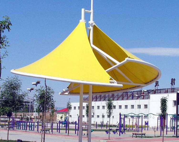 由于膜材料本身应有的显色性,在夜间彩灯的映射下能形成绚丽缤纷的景观,不仅为人们提供遮阳避雨的空间。同时,更由于这种生动活泼的造型能给人们带来时尚、轻松的休闲感受,所以广受欢迎。
